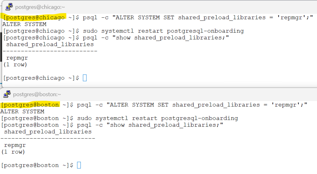 psql -c "ALTER SYSTEM SET shared_preload_libraries = 'repmgr';"