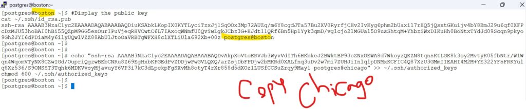 On both Chicago and boston servers as postgres- Display the public key