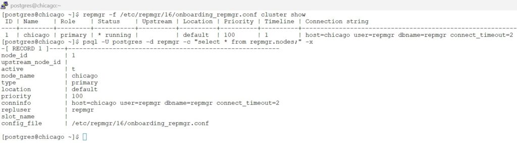 repmgr -f /etc/repmgr/16/onboarding_repmgr.conf cluster show