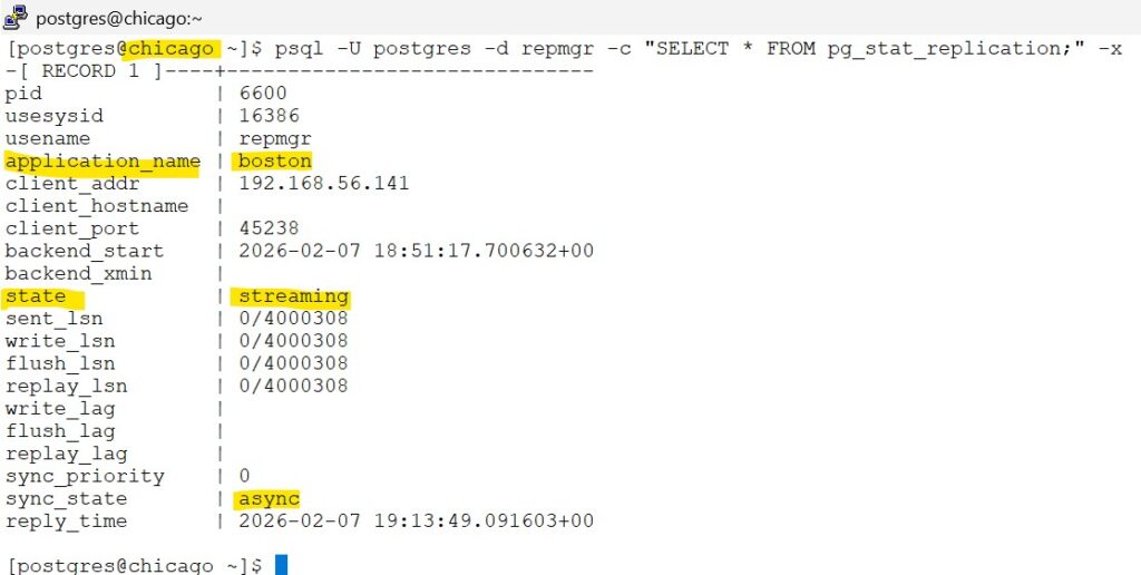psql -U postgres -d repmgr -c "SELECT * FROM pg_stat_replication;" -x