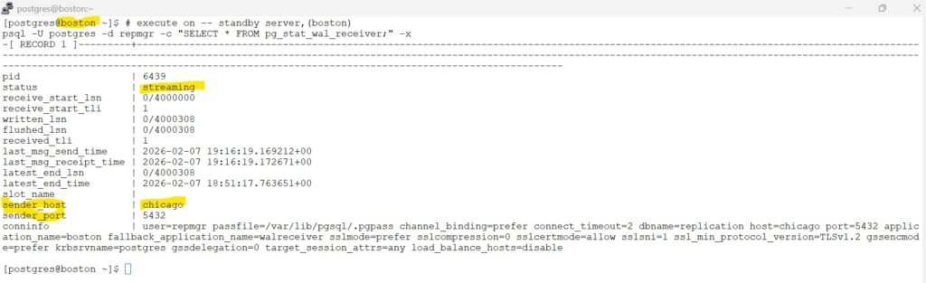 psql -U postgres -d repmgr -c "SELECT * FROM pg_stat_wal_receiver;" -x