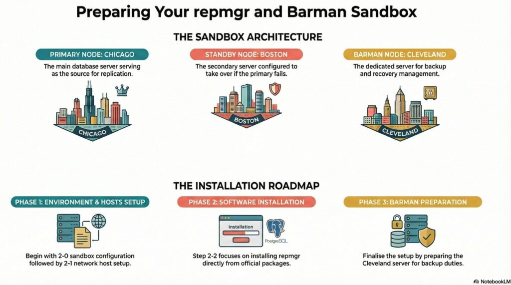 This page explains the step by step configuration of sandbox and implementation of repmgr along with barman according to official documentation